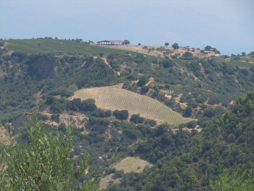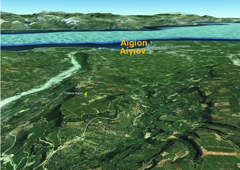 La Trapezà è un’altura subcostiera con ampio pianoro sommitale di forma trapezoidale, a 448 m s.l.m., appartenente a una fascia collinare caratterizzata da rilievi definiti da pendii ripidi e frastagliati a delimitazione di strette vallecole e più ampi solchi terrazzati che definiscono la rete idrografica della regione. I rilievi sono per lo più caratterizzati da sommità conformate a tavolato sub-orizzontale o debolmente inclinati, a quote comprese tra 400 e 600 m ca. La morfologia dei rilievi - a dominio di una fascia planiziale di ca 3.5 km di ampiezza, consistente in un basso plateau debolmente inclinato a SO a ENE, con quote comprese tra 100 e 150 m s.l.m., è stata ampiamente influenzata dall’azione tettonica, in combinazione con fenomeni erosivi e di alterazione della struttura litologica, determinata da conoidi alluvionali di età plio-pleistocenica. Il substrato carbonatico basale, che emerge in corrispondenza del massiccio del Panachaikon, è sormontato nell’area costiera e subcostiera da vari tipi di sequenze deposizionali, comprendenti conglomerati grossolani, sabbie, marne e argille appartenenti ad antichi ambienti lagunari-lacustri. In corrispondenza della Trapezà la sequenza è rappresentata da unità di conglomerati e ghiaie appartenenti ad un conoide deltizio e intercalate da orizzonti di sabbie, marne e argille di origine marina.