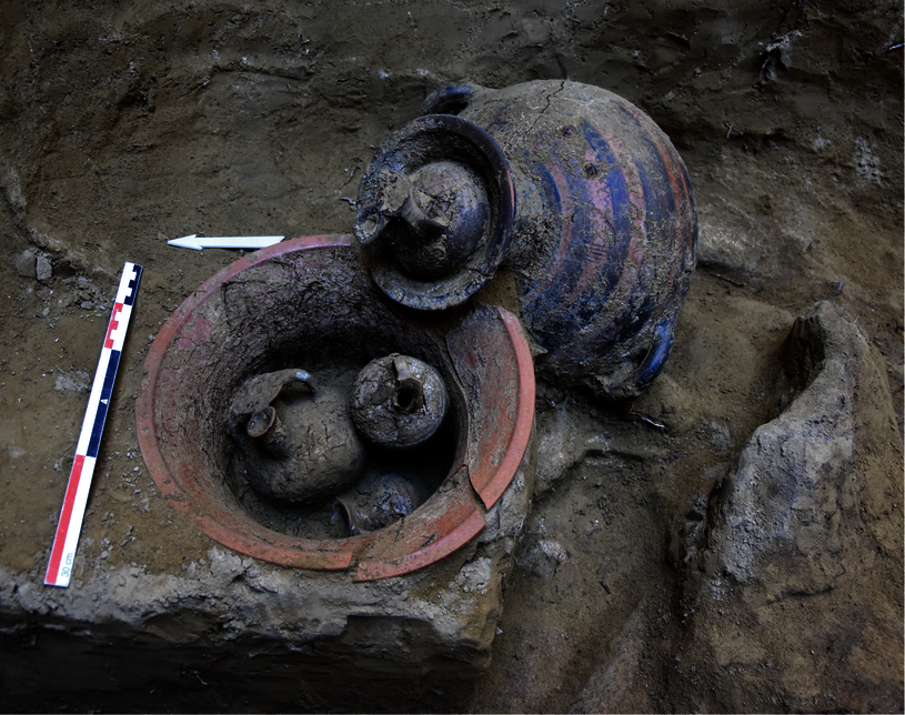 Al TE IIIC medio e tardo appartengono un paio di inumazioni primarie femminili, dotate di conuli e di un set vascolare formato da anforetta a staffa e amphoriskos. Pochi sono tuttavia i contesti primari e rari i corredi ricostruibili integralmente non solo per le complesse pratiche e per la riduzione generalizzata delle sepolture più antiche in depositi strutturati ai margini delle camere, ma anche per le attività di selettiva depredazione messe in atto dai più recenti visitatori delle tombe (TE IIIC/SM). Questi ultimi risultano portatori di una facies culturale propria dell’Acaia occidentale e poco rappresentata ad oggi nella parte orientale della regione: ben esemplificata da un bell’esemplare di duck askos o vaso ornitomorfo della tomba 6 e da diversi contesti che associano grandi vasi, quali anfore e kalathoi, a minute anfore a staffa e lekythoi con decorazione elaborata, questa facies permette di documentare una continuità di frequentazione che altre necropoli achee non ebbero e trova riscontro a Voudeni e Portes, due dei maggiori contesti dell’Acaia occidentale nel territorio di Patrasso.