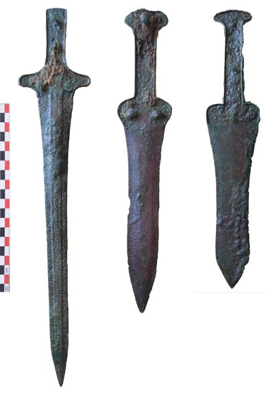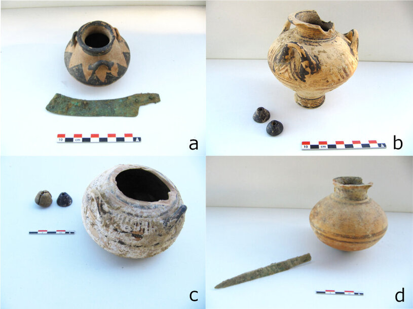 La tomba 8, tra le più semplici e modeste, ha restituito l’inumazione di un individuo supino, in giacitura primaria e inoltre resti disarticolati, ridotti e accantonati insieme a scarni elementi di corredo riferibili ad altri inumati: nel coacervo degli elementi accantonati erano 3 armi da taglio, una spada lunga e due spade corte o daghe, che segnalano la presenza di guerrieri, forse al servizio di un governatore locale che possiamo immaginare sepolto nella vicina Tomba 10. Quest’ultima, le cui dimensioni monumentali non hanno pressoché confronti nelle pur eminenti necropoli dell’Acaia, e sono ben confrontabili con tombe emergenti del Peloponneso nord-orientale ossia delle regioni propriamente palaziali, venne svuotata, forse in un atto di damnatio memoriae, nel corso delle turbolenze che segnarono il difficile periodo del crollo dei sistemi palaziali, e ha dunque restituito poche tracce utili a un’adeguata ricostruzione dei corredi: resti di vasellame in lamina, di gioielli in oro, un sigillo e parte di una lunga spada in bronzo confermano tuttavia con chiarezza che la tomba era destinata alla sepoltura di un gruppo emergente e forse di un individuo con distinta autorità politico-amministrativa.