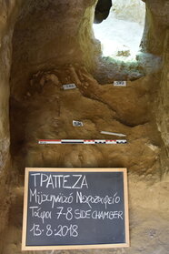 A seguito di una serie di sondaggi geoarcheologici e di ricognizioni mirate, nel 2012 la necropoli è stata identificata alle pendici sudoccidentali dell’acropoli naturale della Trapezà, in località Haghios Dimitris, in corrispondenza di un poggio che sembra costituire una sorta di segnacolo naturale, emergente nel paesaggio circostante.