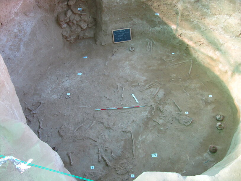 Le tombe indagate si dispongono ad ameno tre livelli lungo il versante meridionale della Trapezà, a distanze di pochi metri l’una dall’altra, parallele tra loro e orientate grosso modo nord-sud. Si tratta di tombe a camera scavate nella roccia tenera del substrato, che nel punto prescelto per l’impianto della necropoli, salvo sporadici affioramenti di conglomerato, è pura sabbia.